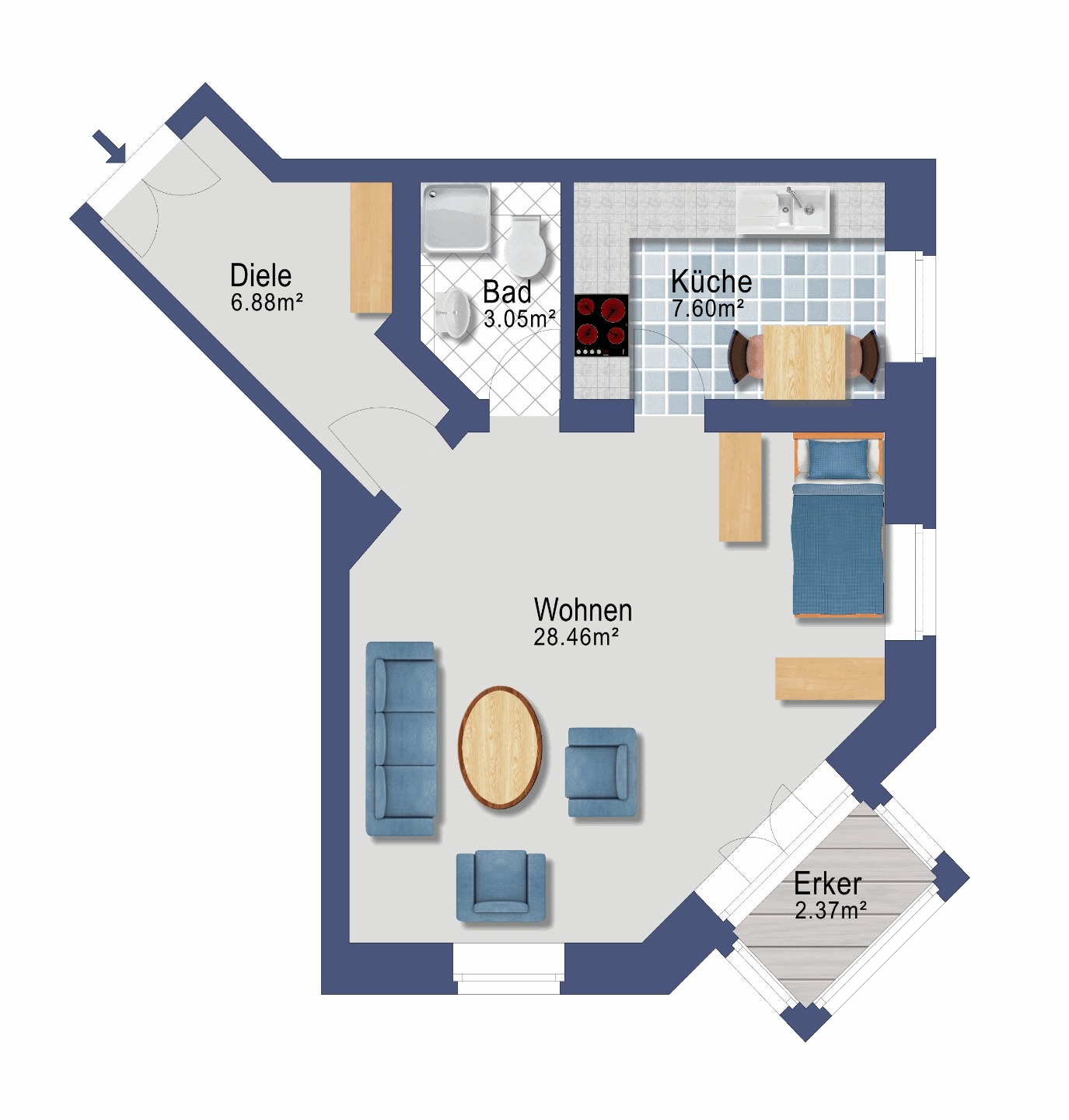 The beautiful and well laid out flat is located on the 1st floor. The flat is easily accessible via the beautiful staircase. The approx. 28.50 m² living room and bedroom have an additional small bay window. The living room and kitchen have a lot of daylight due to the windows. The tiled bathroom is inside. The windows offer a view of the quiet street with a south-east orientation.