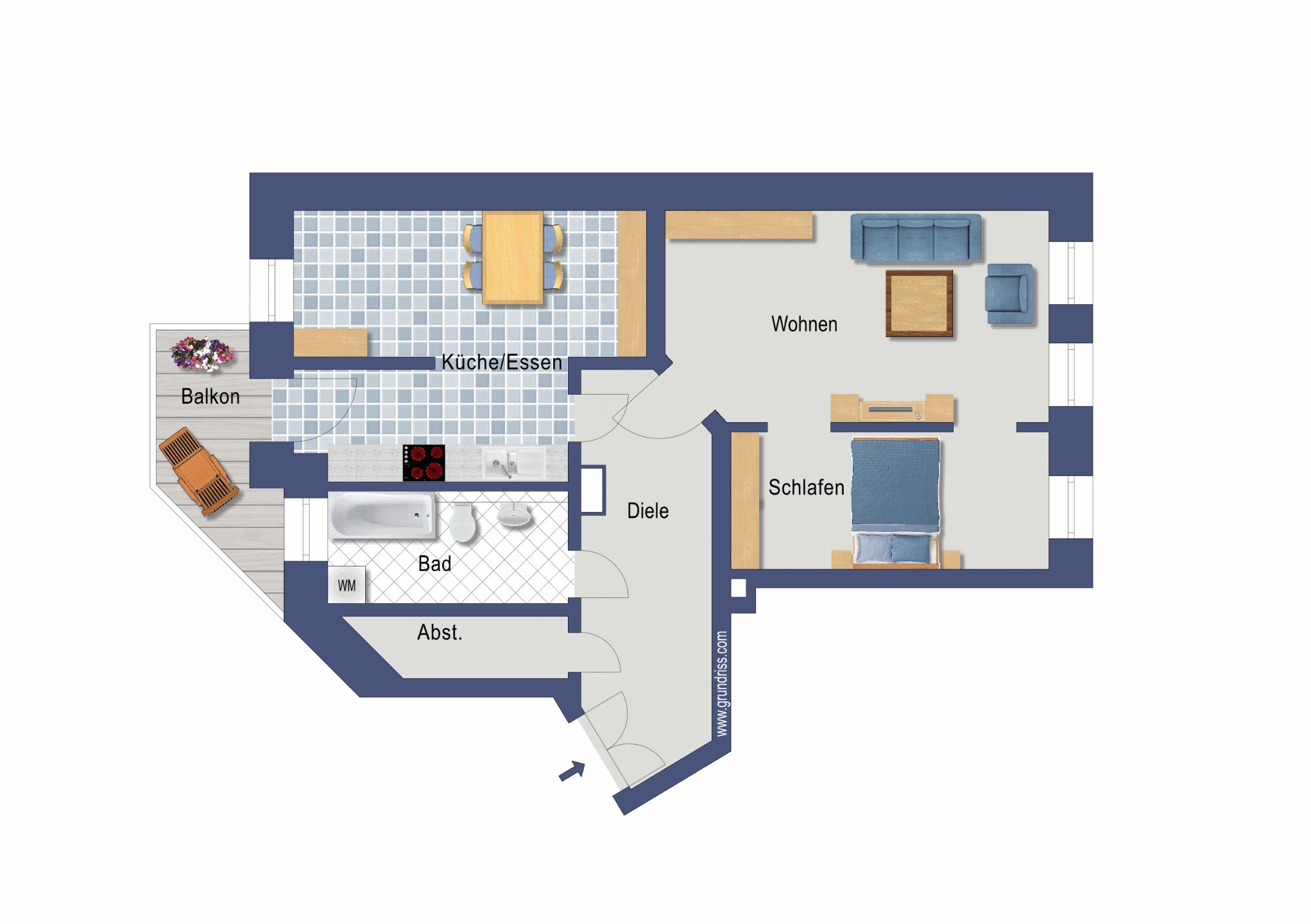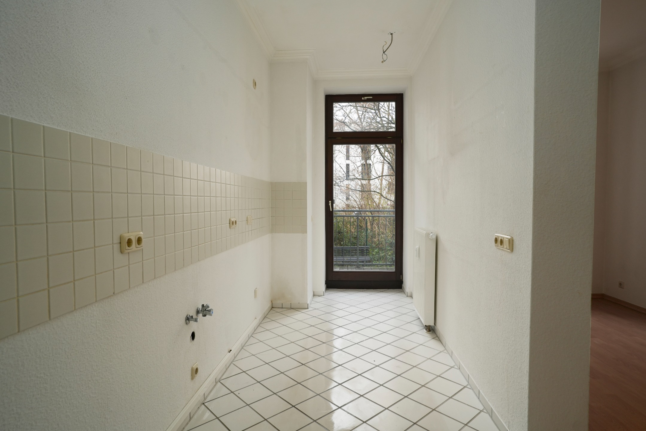 Straße, der Balkon geht in den Innenhof. Die Wohnräume und der Flur
