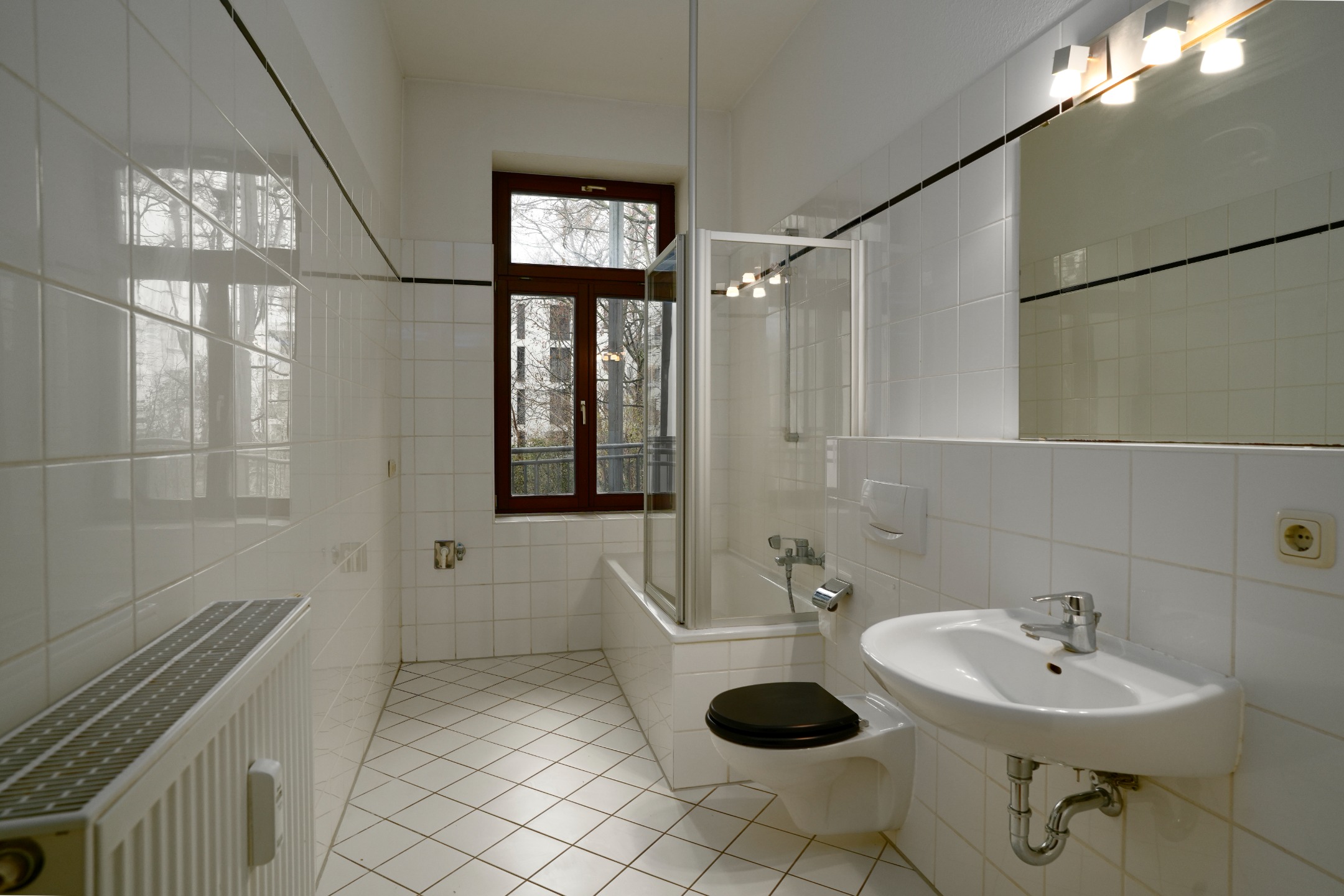 Das geflieste Bad hat eine Wanne. Über die Fenster haben Sie einen Blick in die ruhige