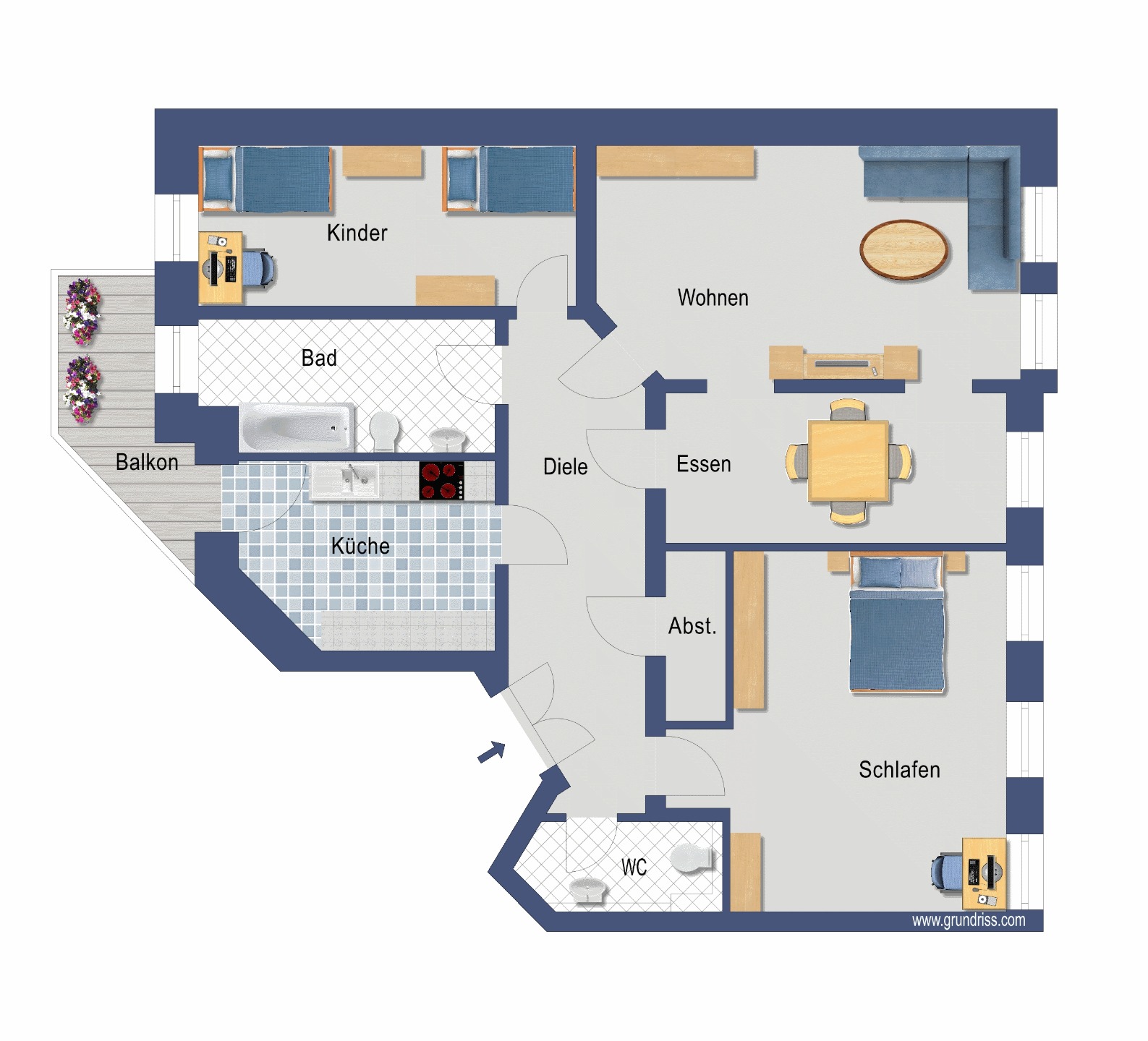 Straße, der Balkon geht in den Innenhof. Die Wohnräume und der Flur