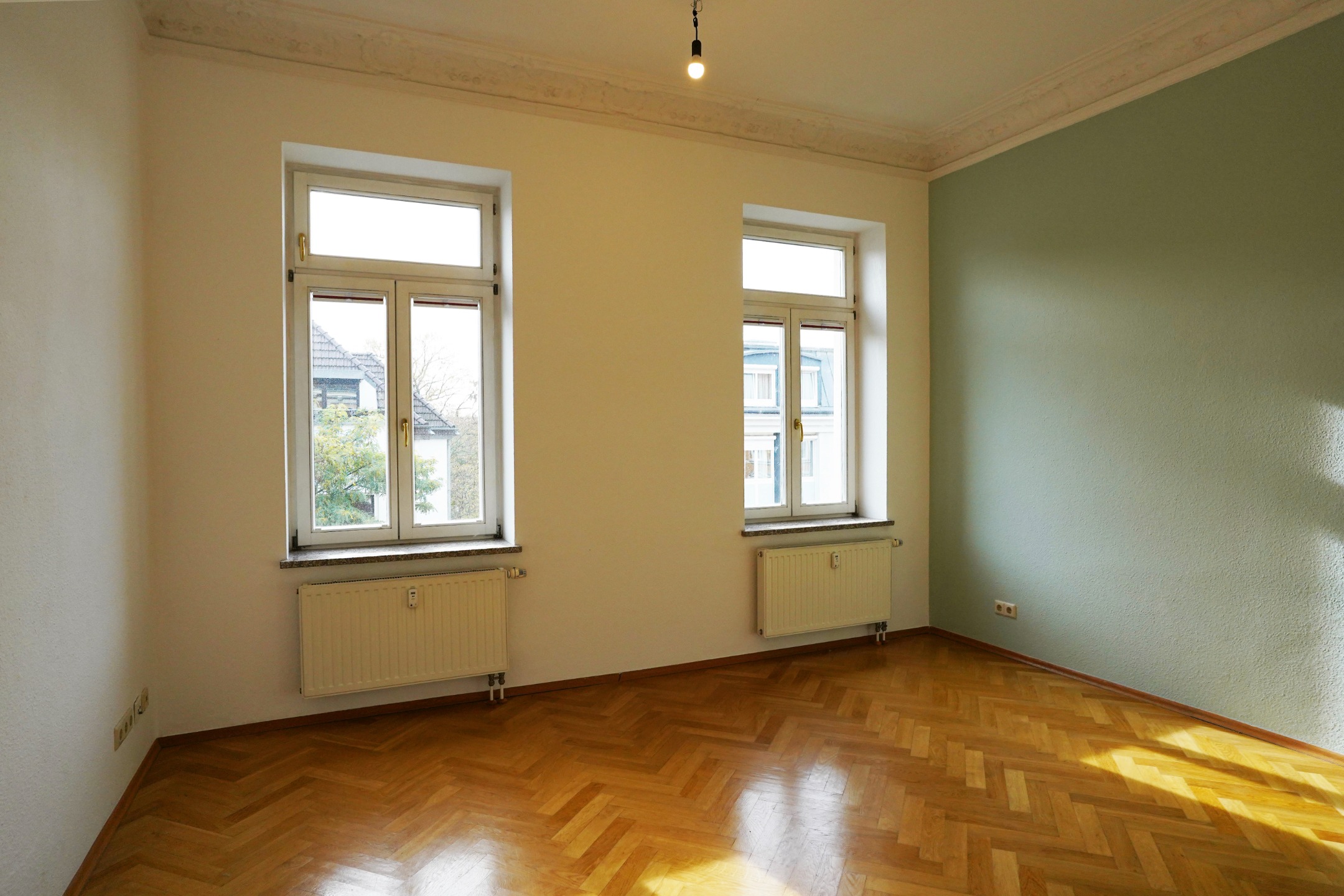 The very bright and well cut 2 room flat is located on the 3 floor. All rooms have a lot of daylight with direct sun, in the kitchen there is enough space for a small dining table. The bathroom is tiled and has a bathtub, the connection for the washing machine is in the kitchen. The furnishings with wooden windows, stone window sills, parquet flooring and solid wood interior doors give a high-quality impression.
