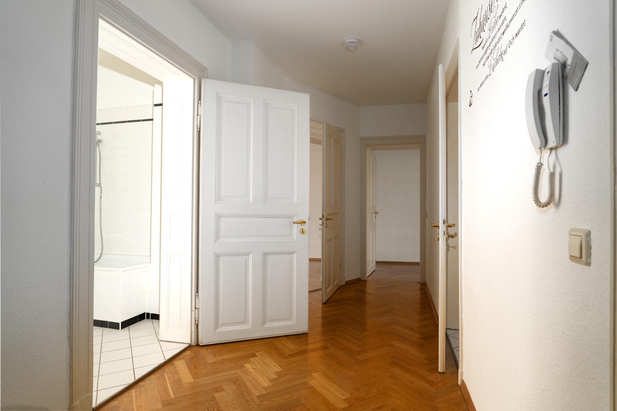 All flats from the ground floor to the third floor have balconies facing the green and quiet inner courtyard, the converted attic floor has no terraces. The classic old building elements such as stucco façade, wooden coffered interior doors and partly parquet and stucco in the individual flats are present and have been professionally refurbished and the windows have been replaced and are made of wood with double glazing.