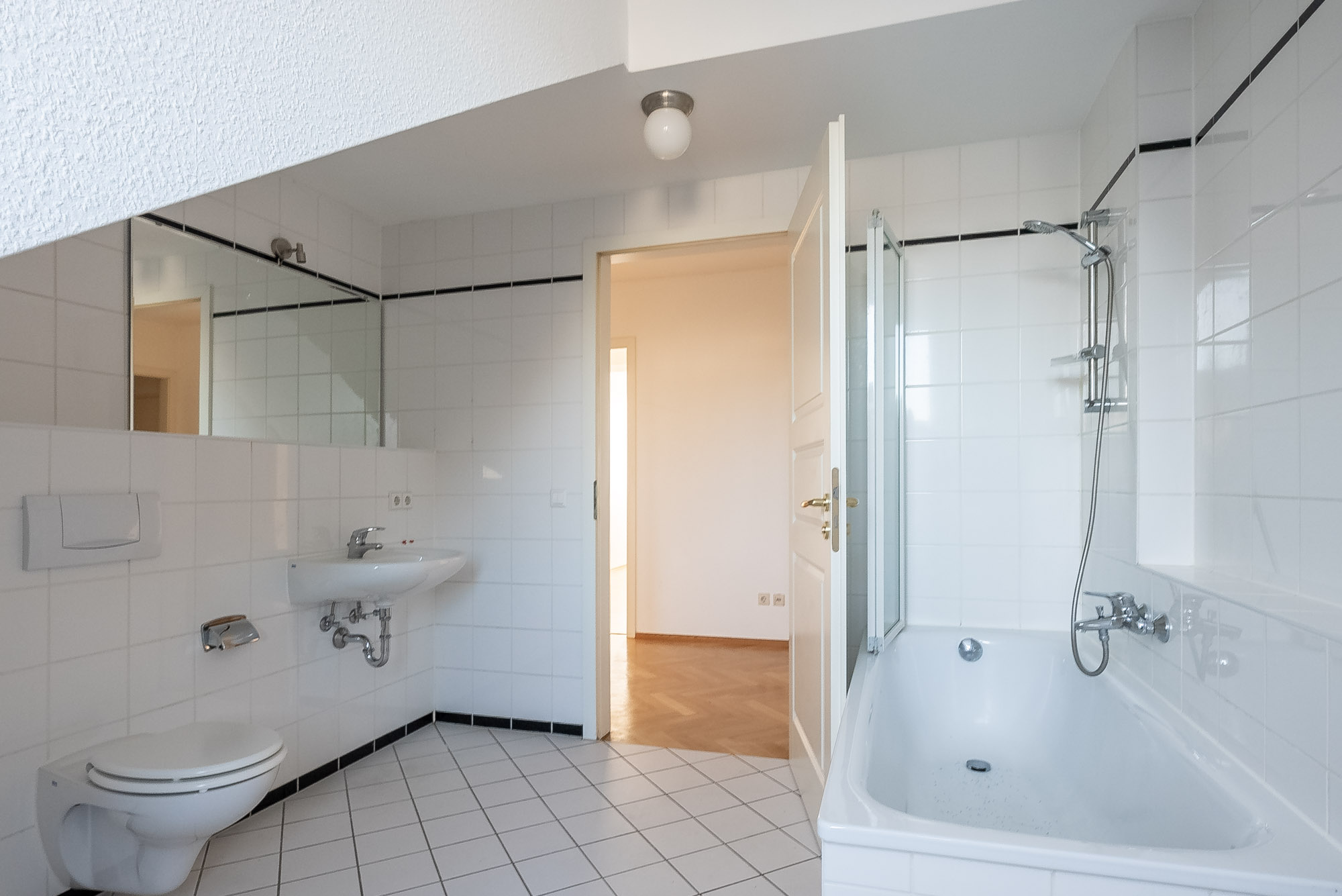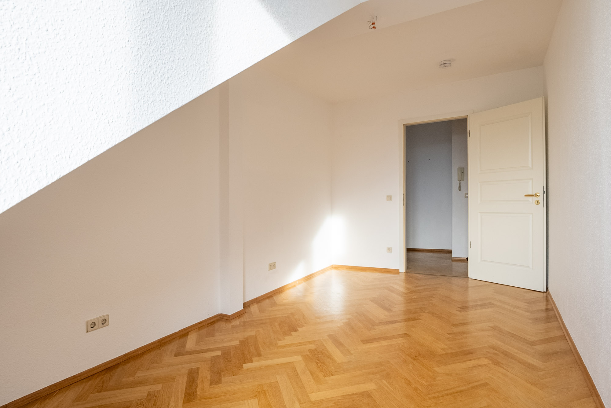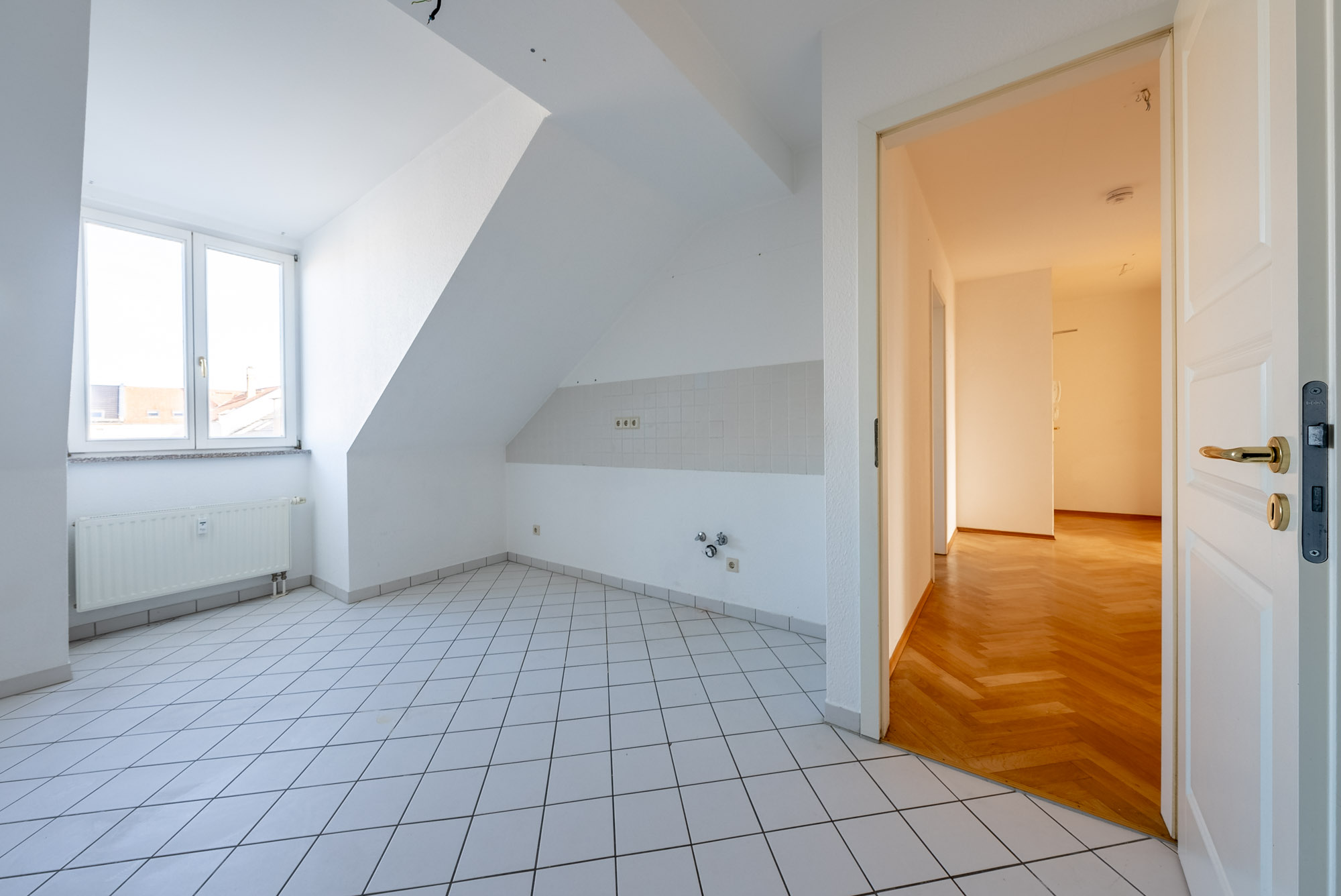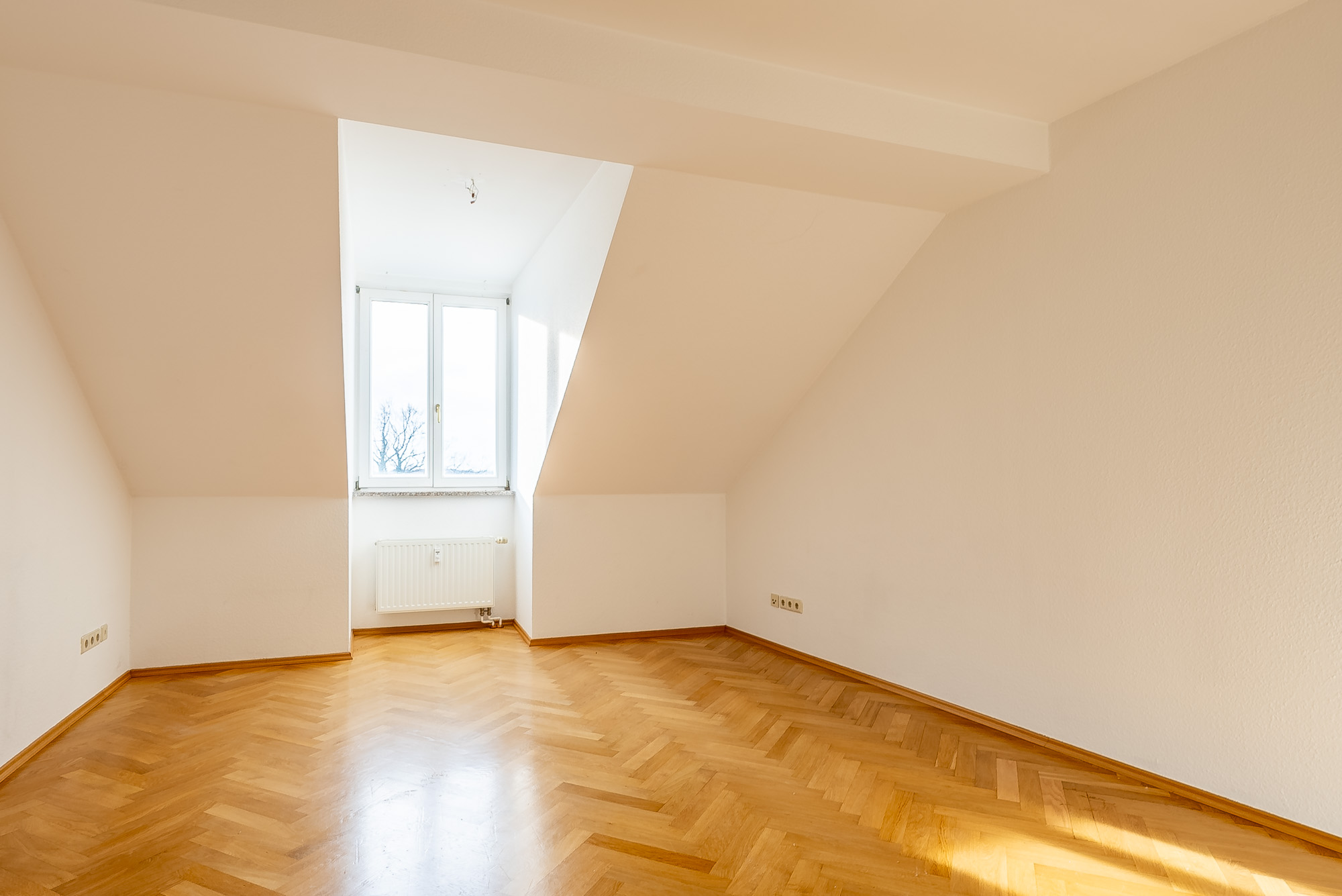 The very bright and well cut 2 room flat is located on the 4th floor. All rooms have a lot of daylight with direct sun, in the kitchen there is enough space for a small dining table. The bathroom is tiled and has a bathtub, the connection for the washing machine is in the kitchen. The furnishings with wooden windows, stone window sills, parquet flooring and solid wood interior doors give a high-quality impression.
