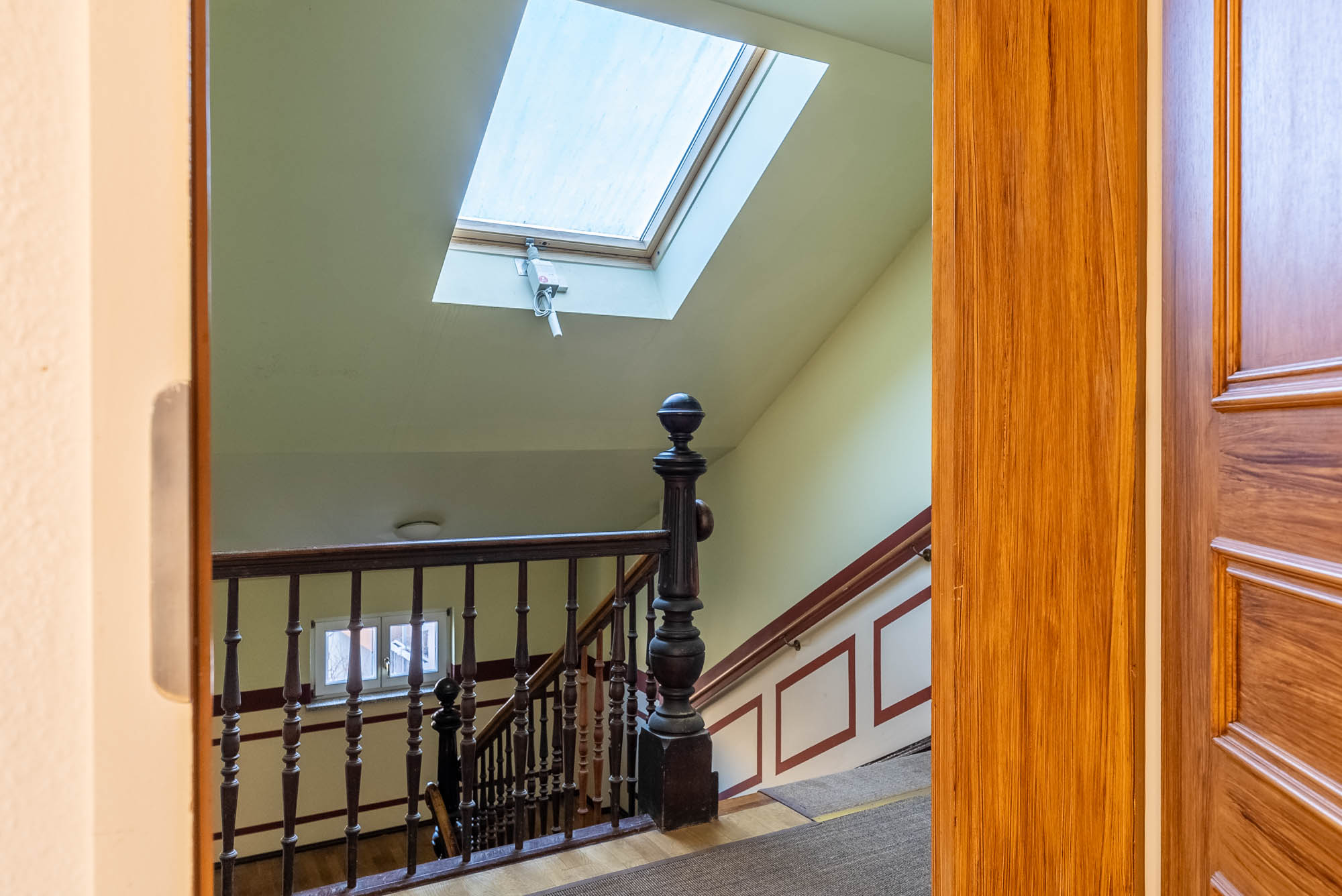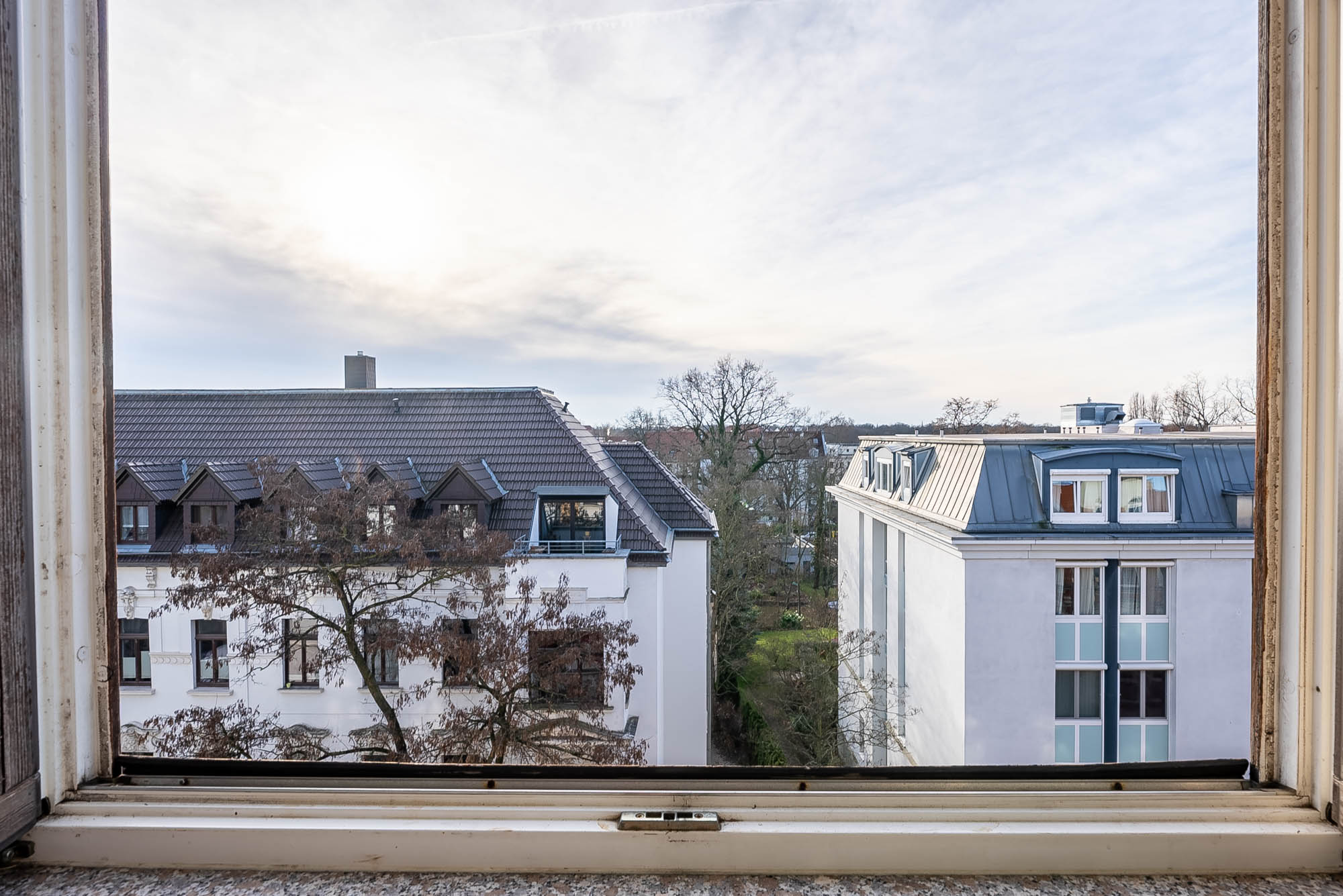 All flats from the ground floor to the third floor have balconies facing the green and quiet inner courtyard, the converted attic floor has no terraces. The classic old building elements such as stucco façade, wooden coffered interior doors and partly parquet and stucco in the individual flats are present and have been professionally refurbished and the windows have been replaced and are made of wood with double glazing.