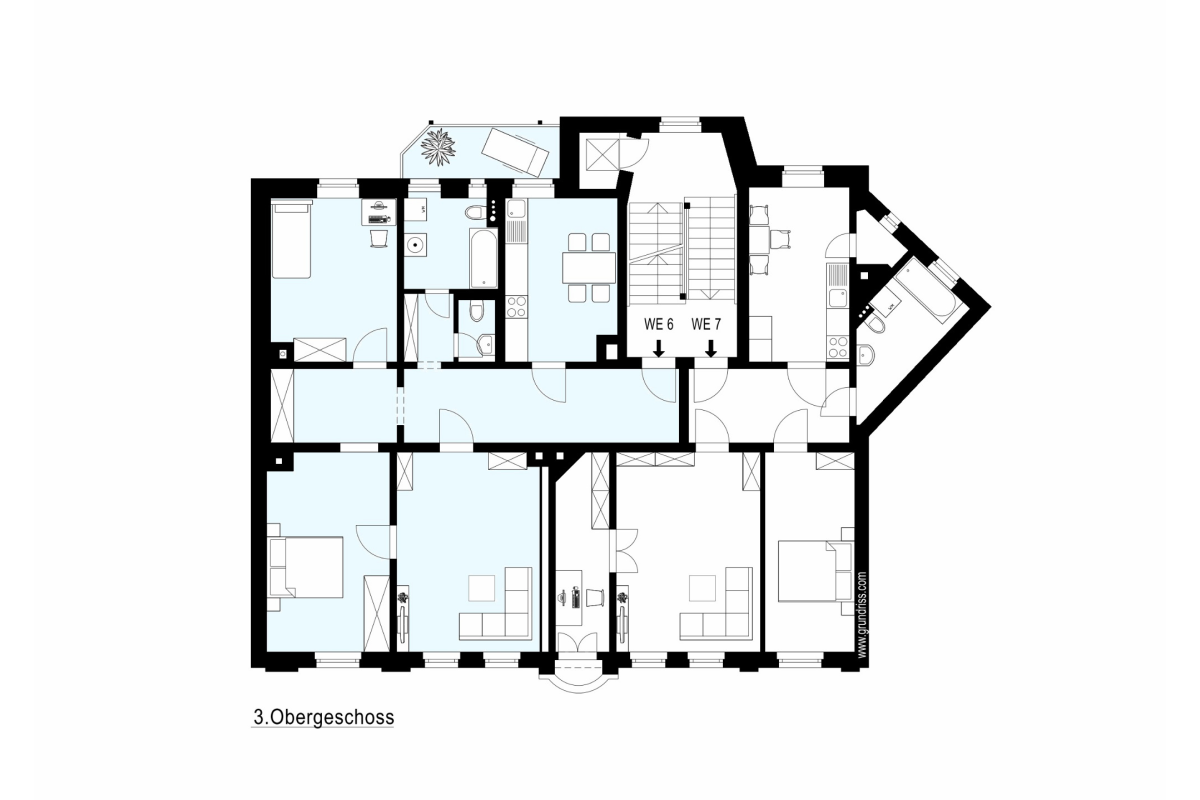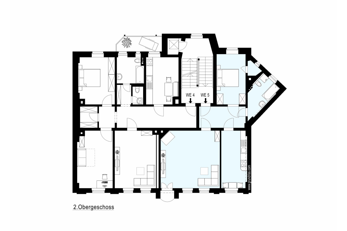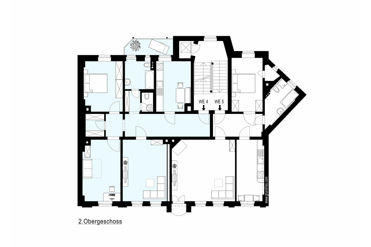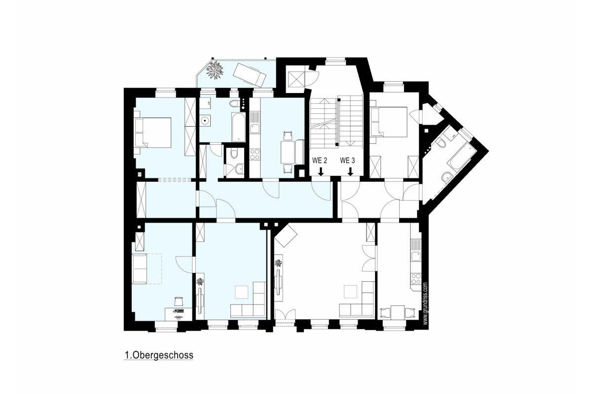 All flats on the right side from the 1st floor to the 3rd floor have a balcony facing the inner courtyard, the attic flat on the right has a terrace. The beautiful stucco façade was professionally refurbished, the windows were replaced by modern wooden windows with insulating glazing. There is a private green courtyard with a play area for children.