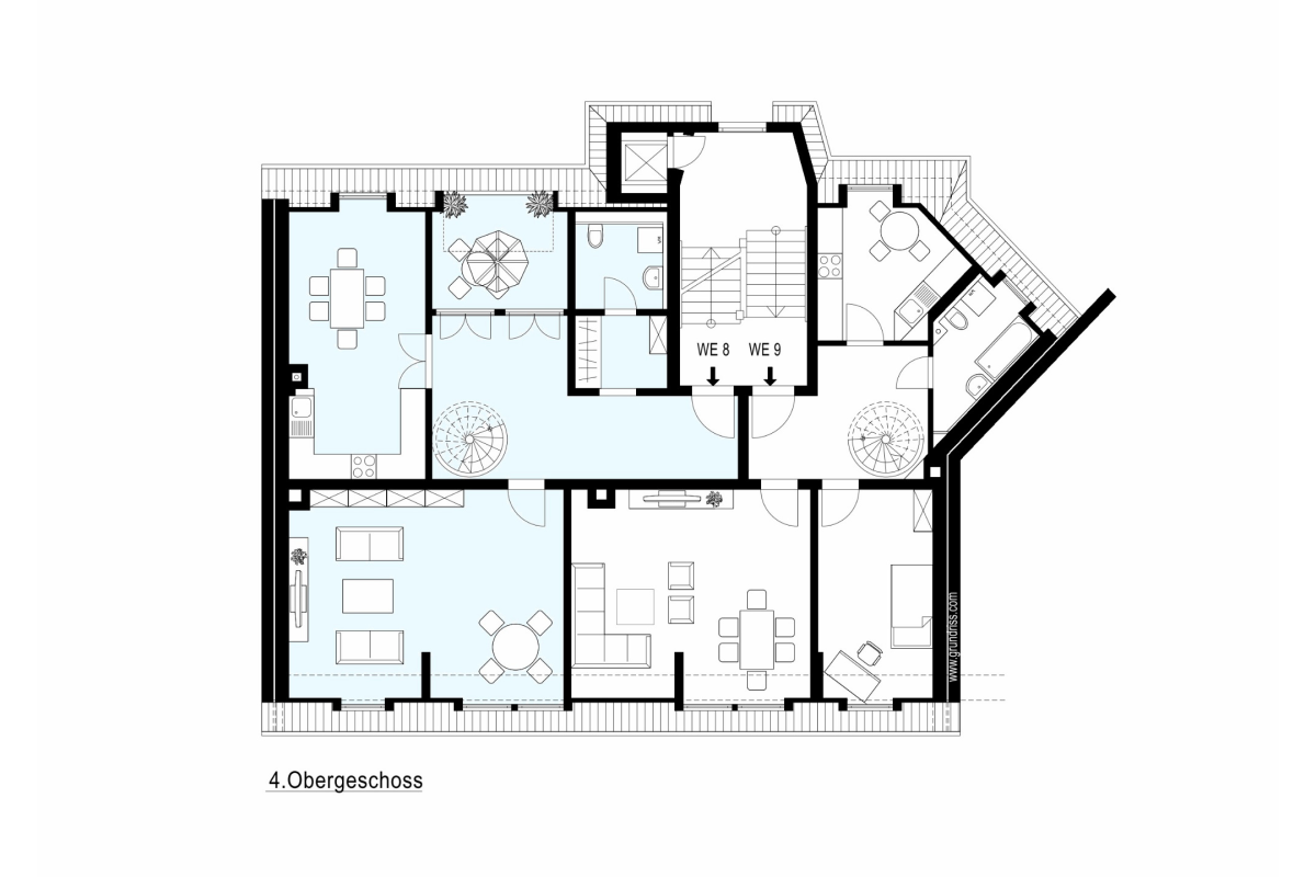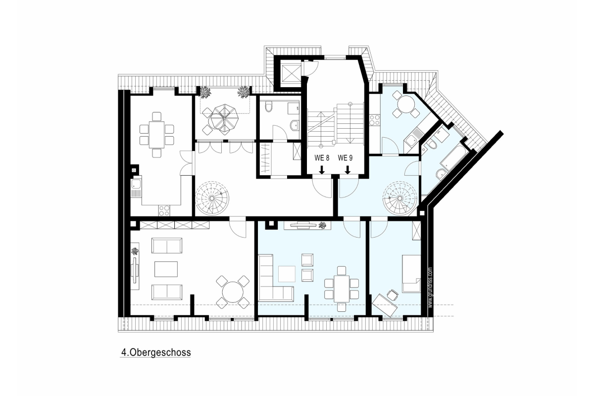 Balkon in den Innenhof, die rechte Dachgeschoßwohnung hat eine Terrasse.